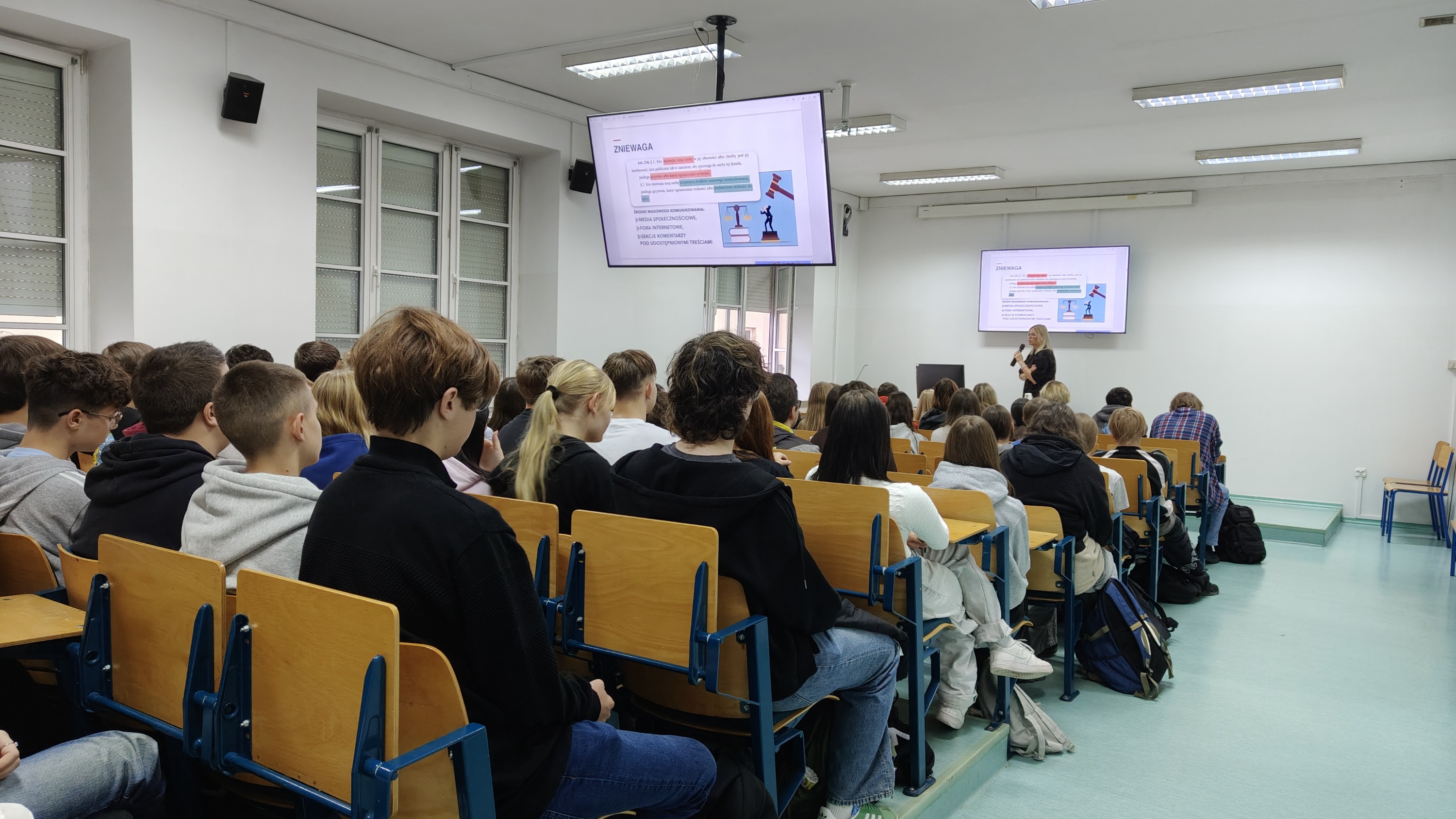 Tematem prelekcji było niezwykle aktualne i ważne zagadnienie „Prawo vs. hejt. Szkoła wolna od hejtu”. Pani mecenas w przystępny i profesjonalny sposób przybliżyła młodzieży pojęcie hejtu, jego przyczyny, skutki oraz konsekwencje prawne wynikające z szerzenia nienawiści w Internecie i w życiu codziennym.